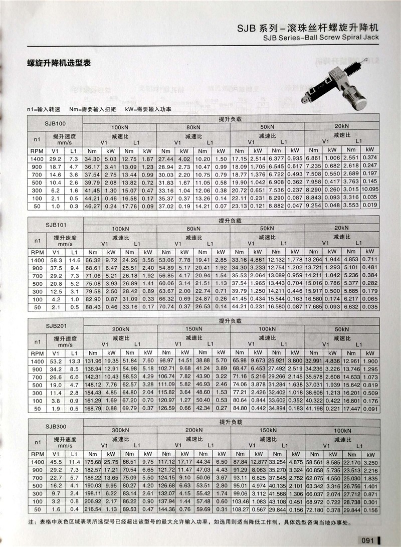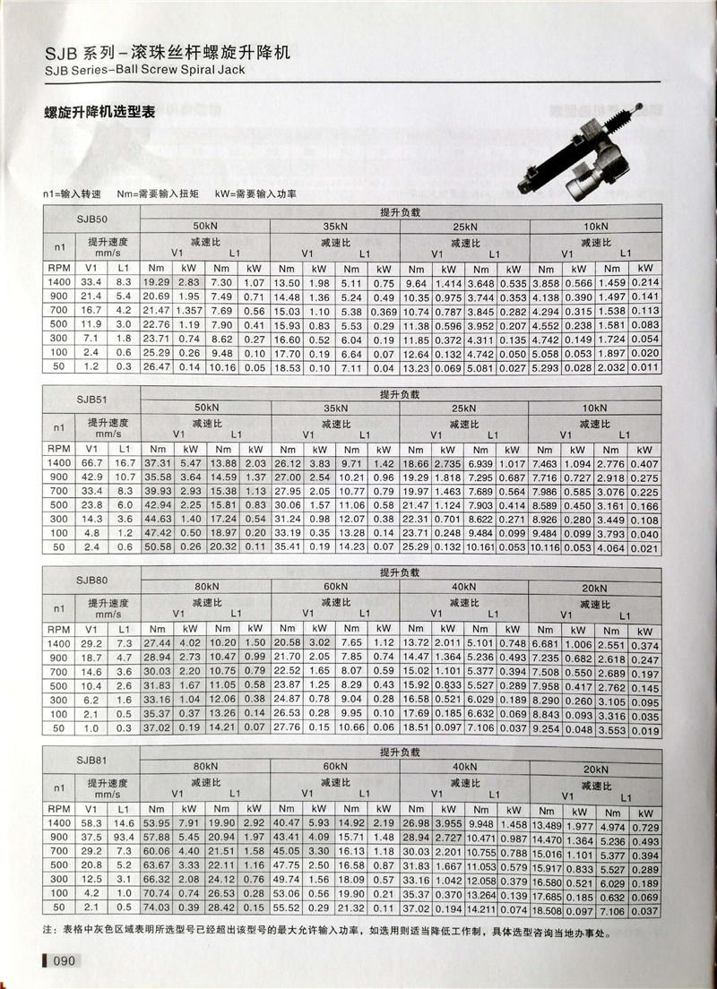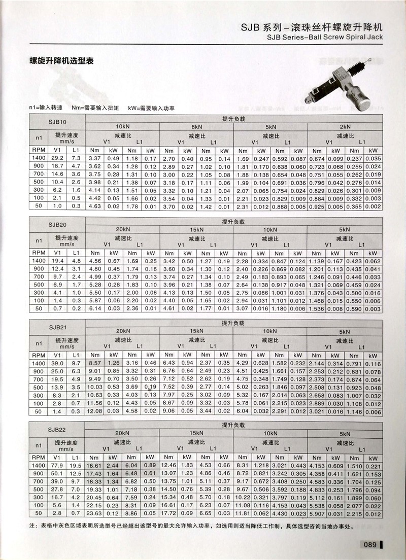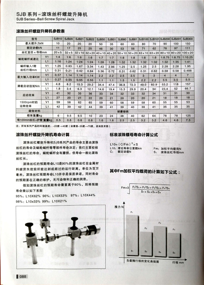 SJB系列滚珠丝杠螺旋升降机产品的寿命主要由滚珠丝杠的寿命及蜗轮蜗杆等零部件寿命决定;我们主要校核滚珠丝杠的寿命,蜗轮蜗杆会有磨损,但寿命一般比滚珠丝杠长。滚珠丝杠的预期寿命L10是90%的滚珠丝杠在金属材料疲劳失效前所能达到或超过的运行距离。单位为百万毫米。滚珠丝杠预期寿命L10并非是保质承诺,同时寿命的预期要在正确的维护,无污染物和正确的润滑。