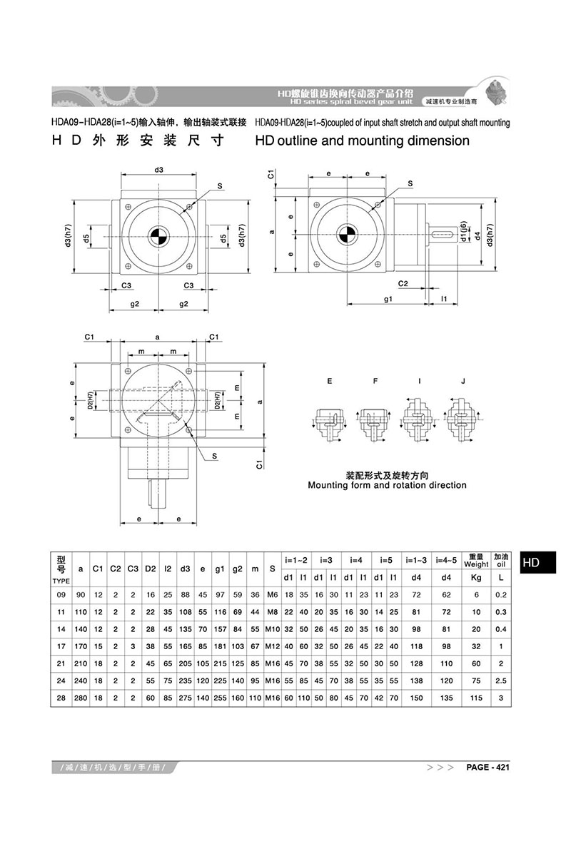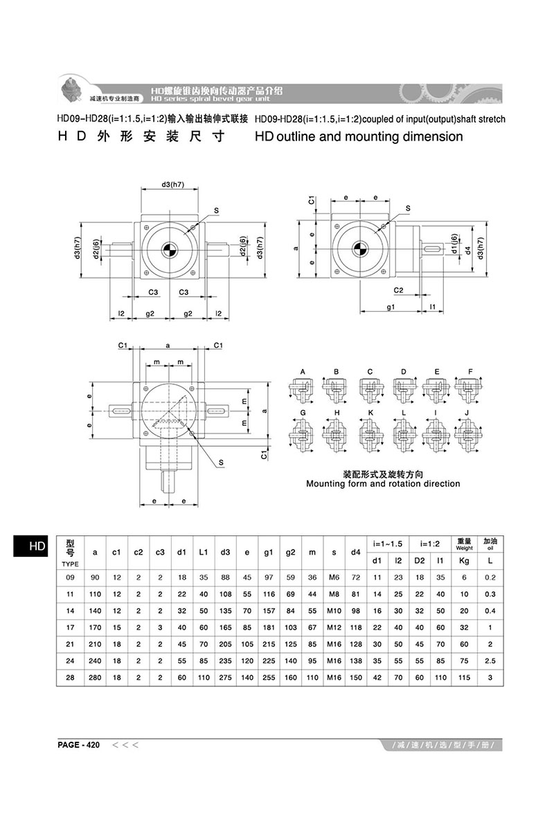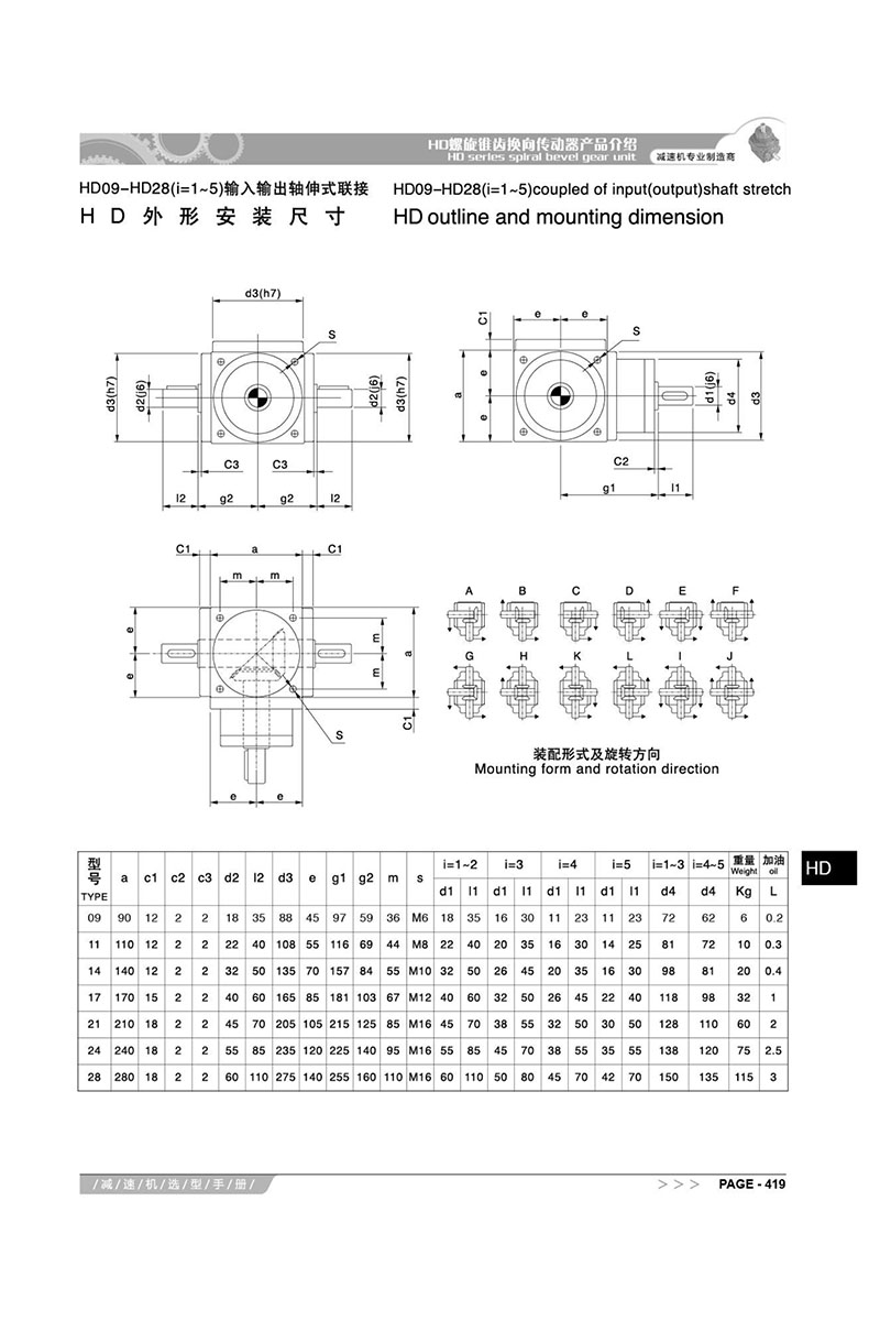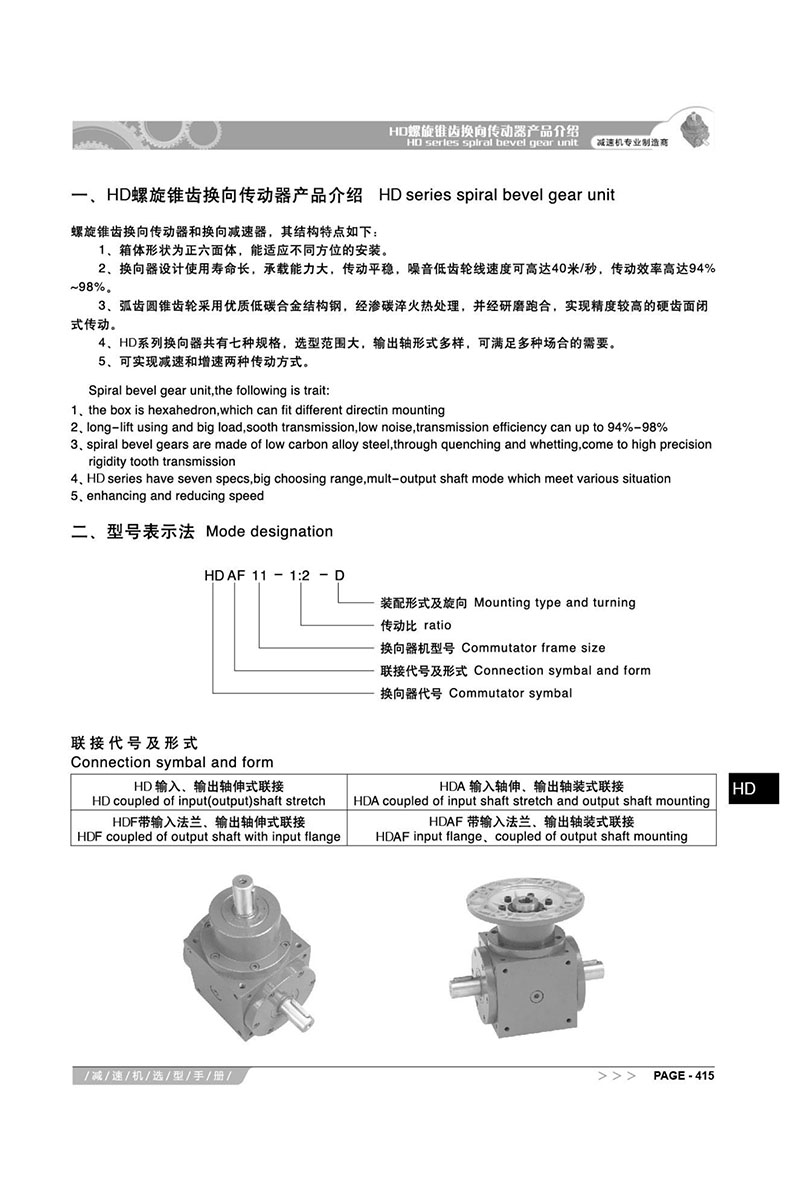 4、HD螺旋锥齿换向器共有七种规格,选型范围大,输出轴形式多样,可满足多种场合的需要;