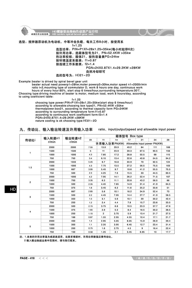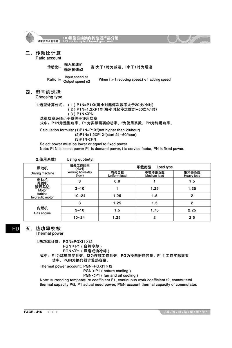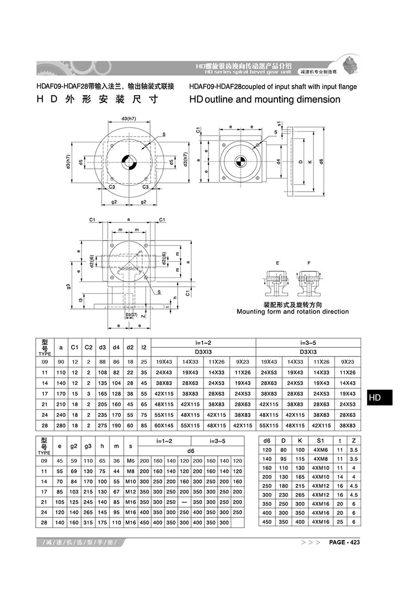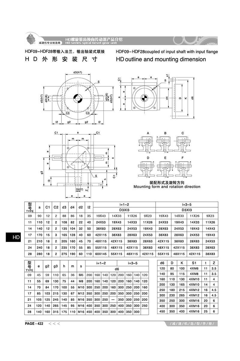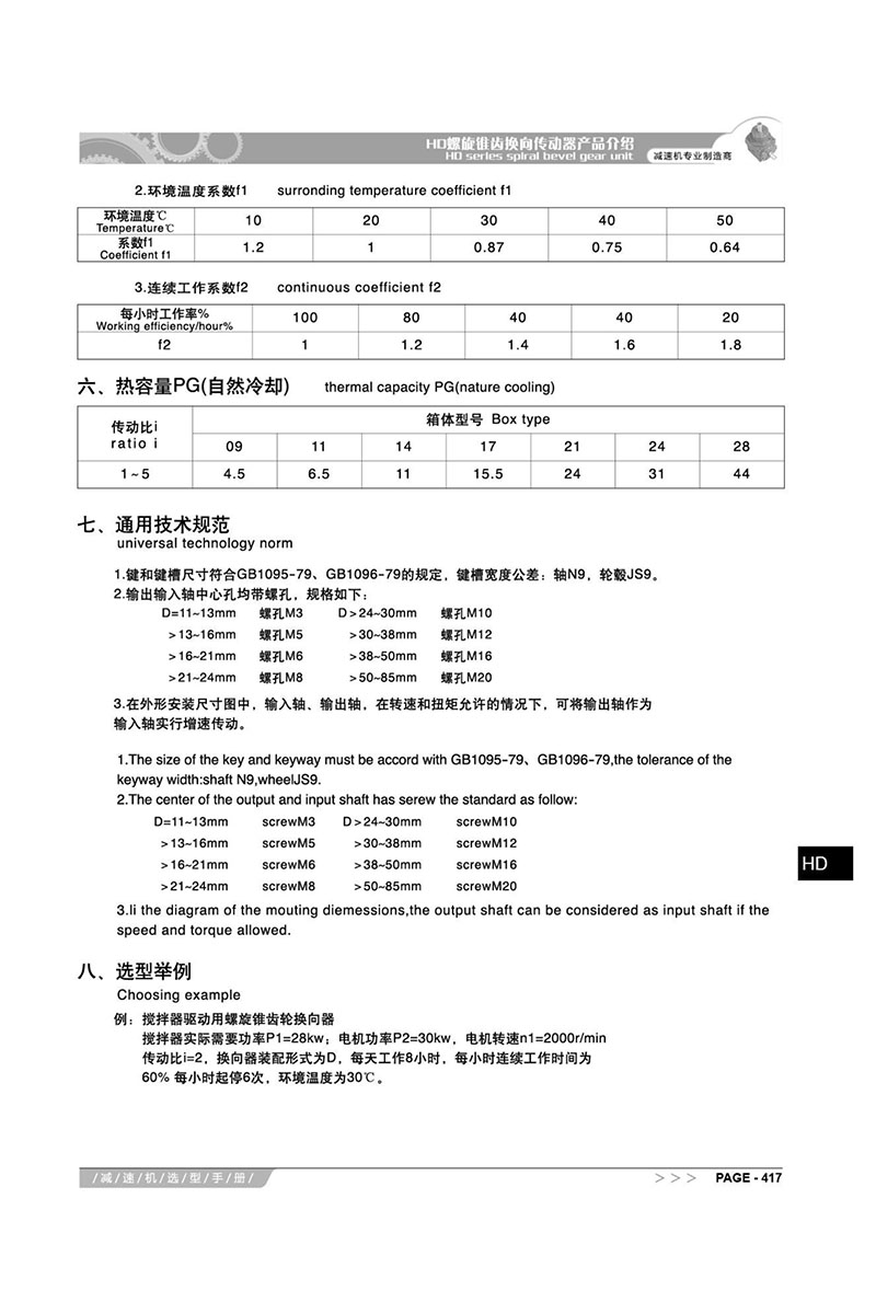 4、HD螺旋锥齿换向器共有七种规格,选型范围大,输出轴形式多样,可满足多种场合的需要;