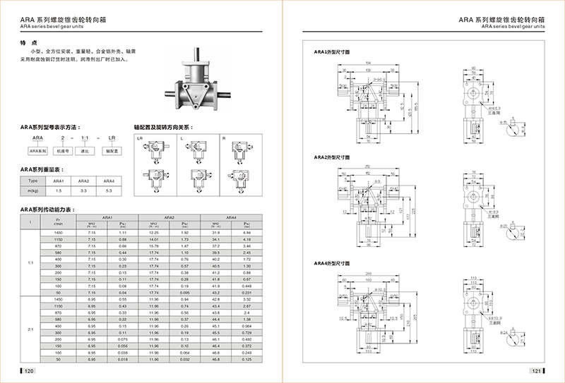 ARA系列螺旋锥齿轮转向箱采用科学的设计方案,是传动设备行业不可缺少的产品。ARA系列转向箱重量轻、体积小、载重大;外壳坚固,采用铝合金压铸而成;外型美观,设计合理,可正反运转,输入、输出方式采用多方位结构,且输出方式多样。适用范围广、扭矩大、噪音低、寿命长。